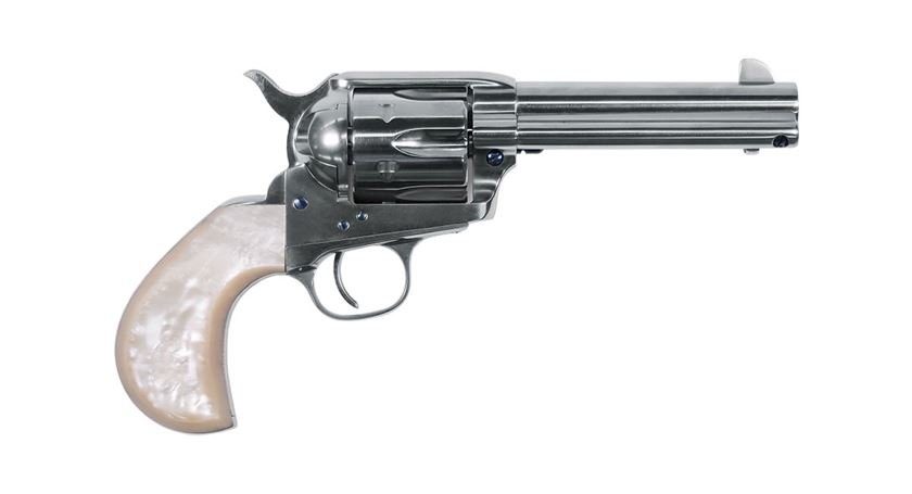 Doc Holliday is one of the most beloved dandy-gamblers in American lore, who often doubled as a lawman on the side of his friend Wyatt Earp. This revolver follows the lines of Doc’s Lightning revolver, but is available in the more reliable 1873 action and the powerful .45 Colt cartridge. Doc has a full nickel plated steel finish with a pearl-style grip.